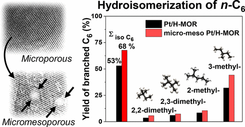 This paper describes a study of the nature and the accessibility of the acid sites in micromesoporous mordenite zeolites obtained by desilication and dealumination and analysis of their activity and selectivity in the hydroisomerization of n-hexane. Alkaline–acid, acid–alkaline–acid, and fluorination–alkaline–acid p...